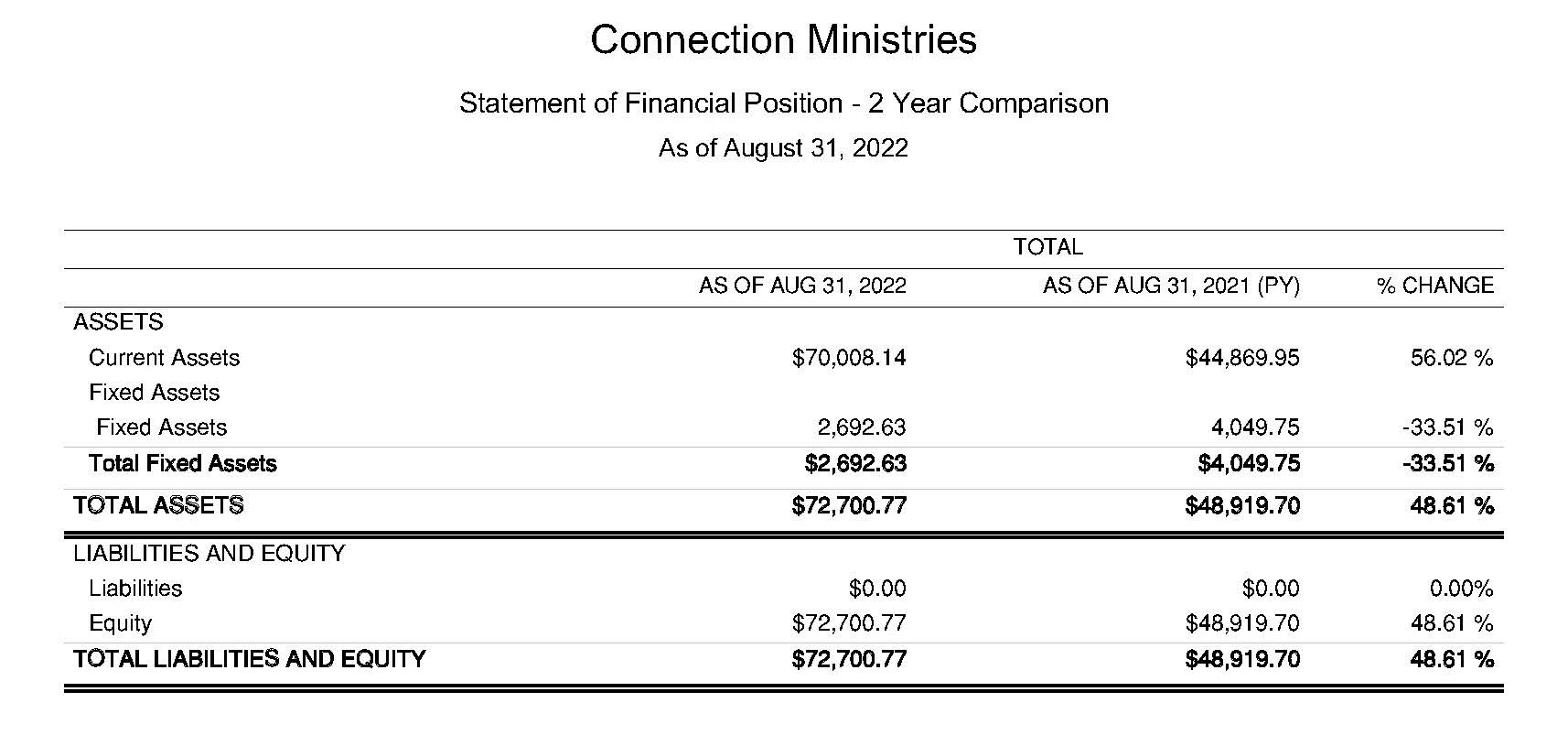 In the past fiscal year, Connection Ministries was blessed with the support from 262 churches, organizations, families, and individuals. They supported our work with $144,758. This was down from the previous year, only because we received $20,300 in the previous year from the federal Paycheck Protection Program. Donated funds actually increased during this past year by $6,501, which is almost a 5% increase. We are grateful to God and all of you.