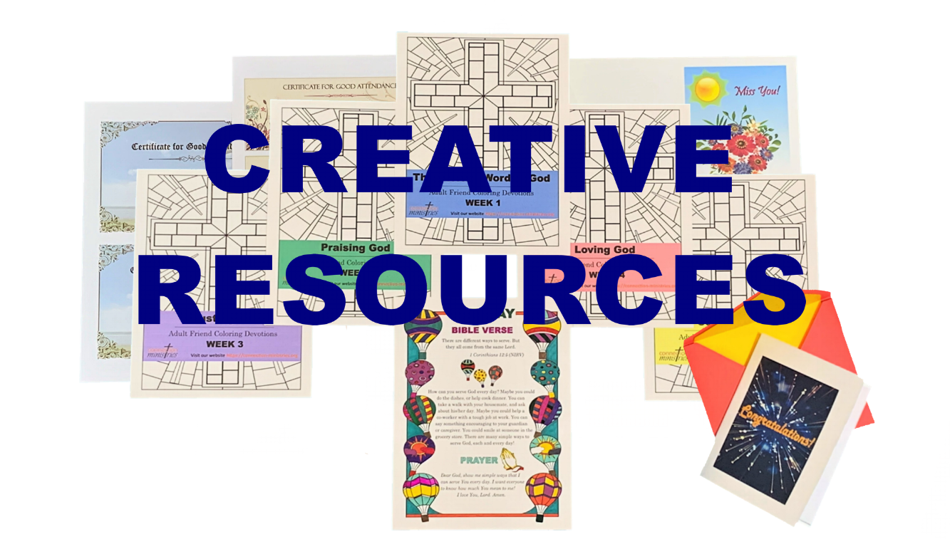 Resources are another important way for Connection Ministries to equip churches to minister with adults with intellectual disabilities. We connect churches to resources developed by both Connection Ministries as well as other organizations. There is no cost to use any of the resources developed by Connection Ministries.