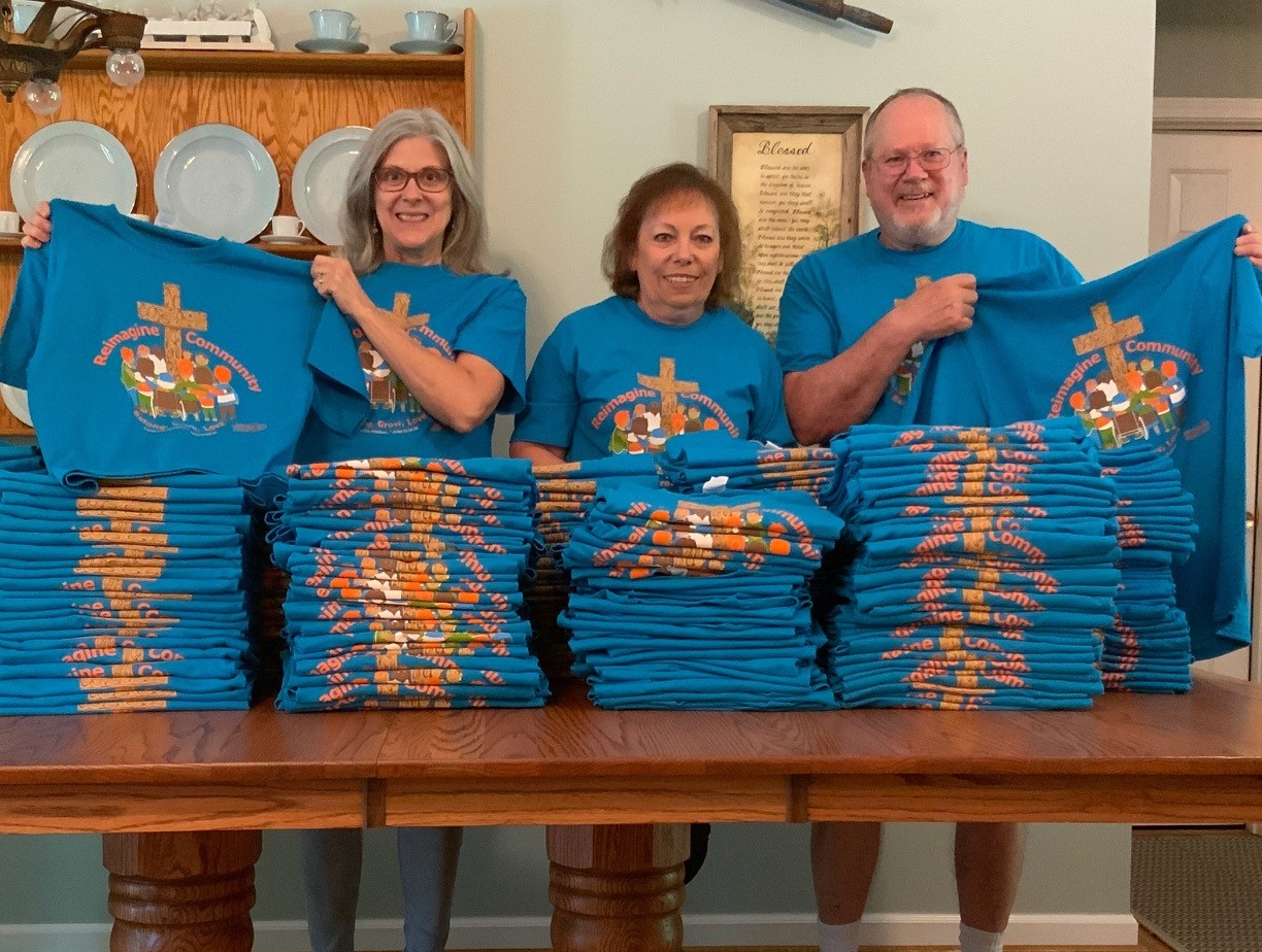 One of our favorite moments each year is our annual “T-shirt folding party.” This watershed day ties together all the work preparing for the Summer Friendship Gatherings and informs us we are about to begin. There are 625 shirts all folded and packed in plastic tubs ready for ten Gatherings.